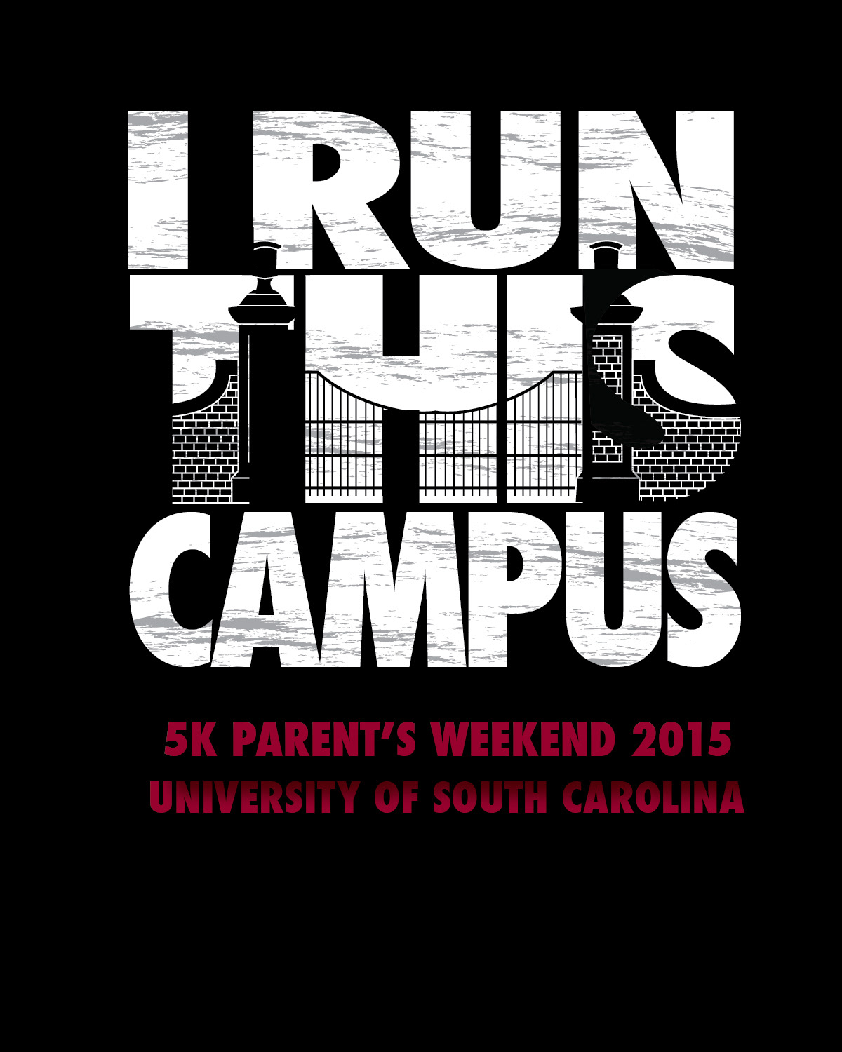 A shirt design for a 5k race in Columbia, South Carolina featuring the historic Horseshoe gates.