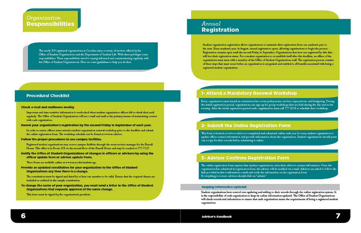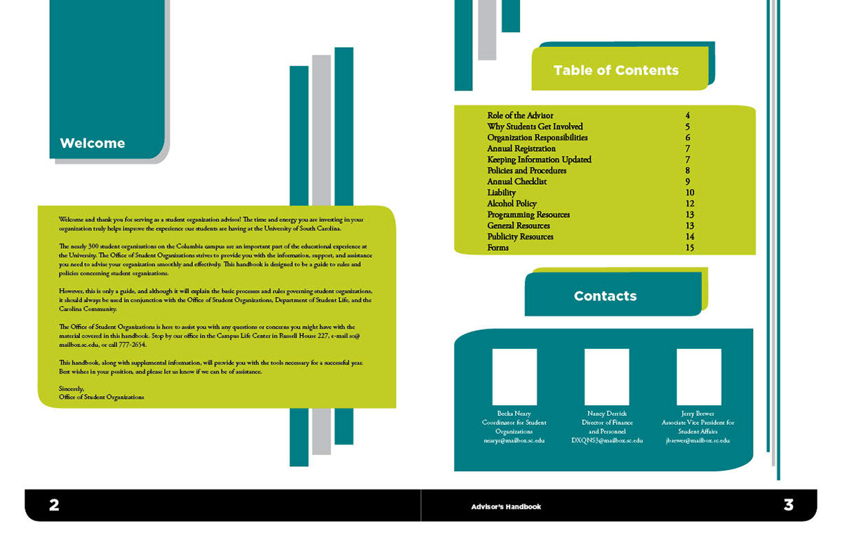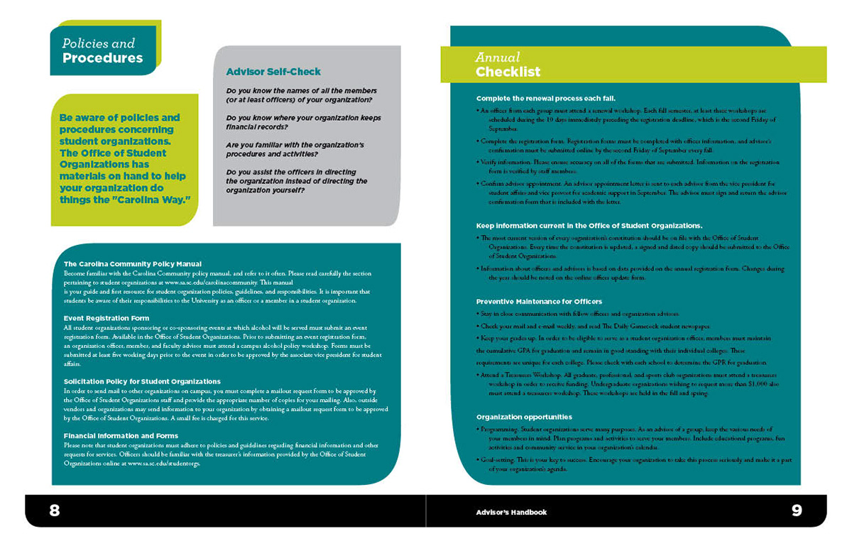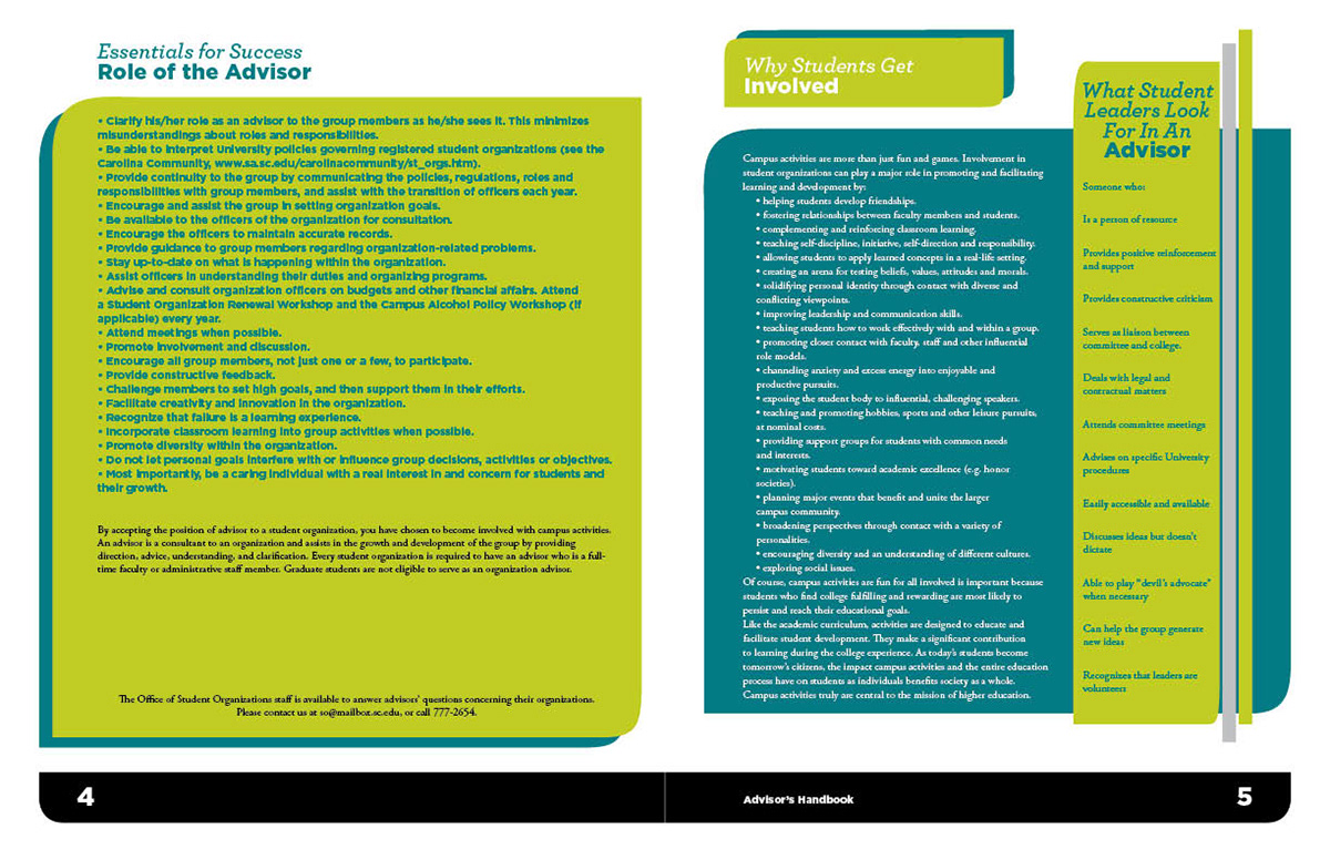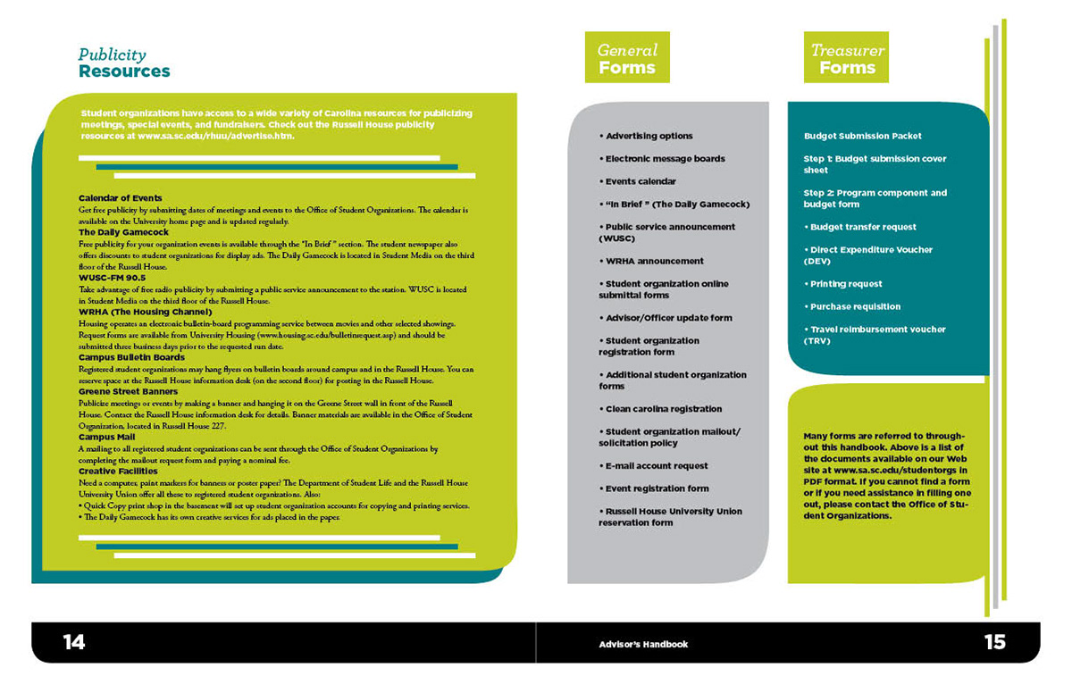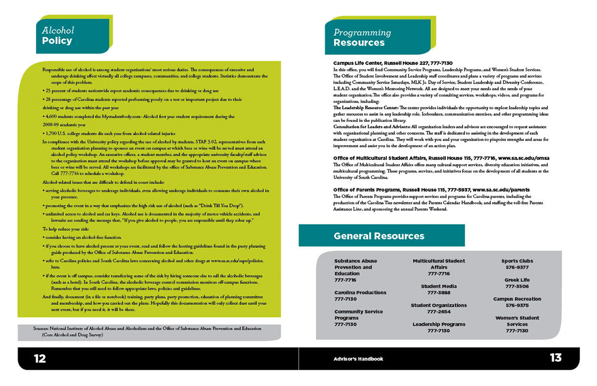 The University of South Carolina's 2015 Advisor's Handbook from the Leadership and Service Center.