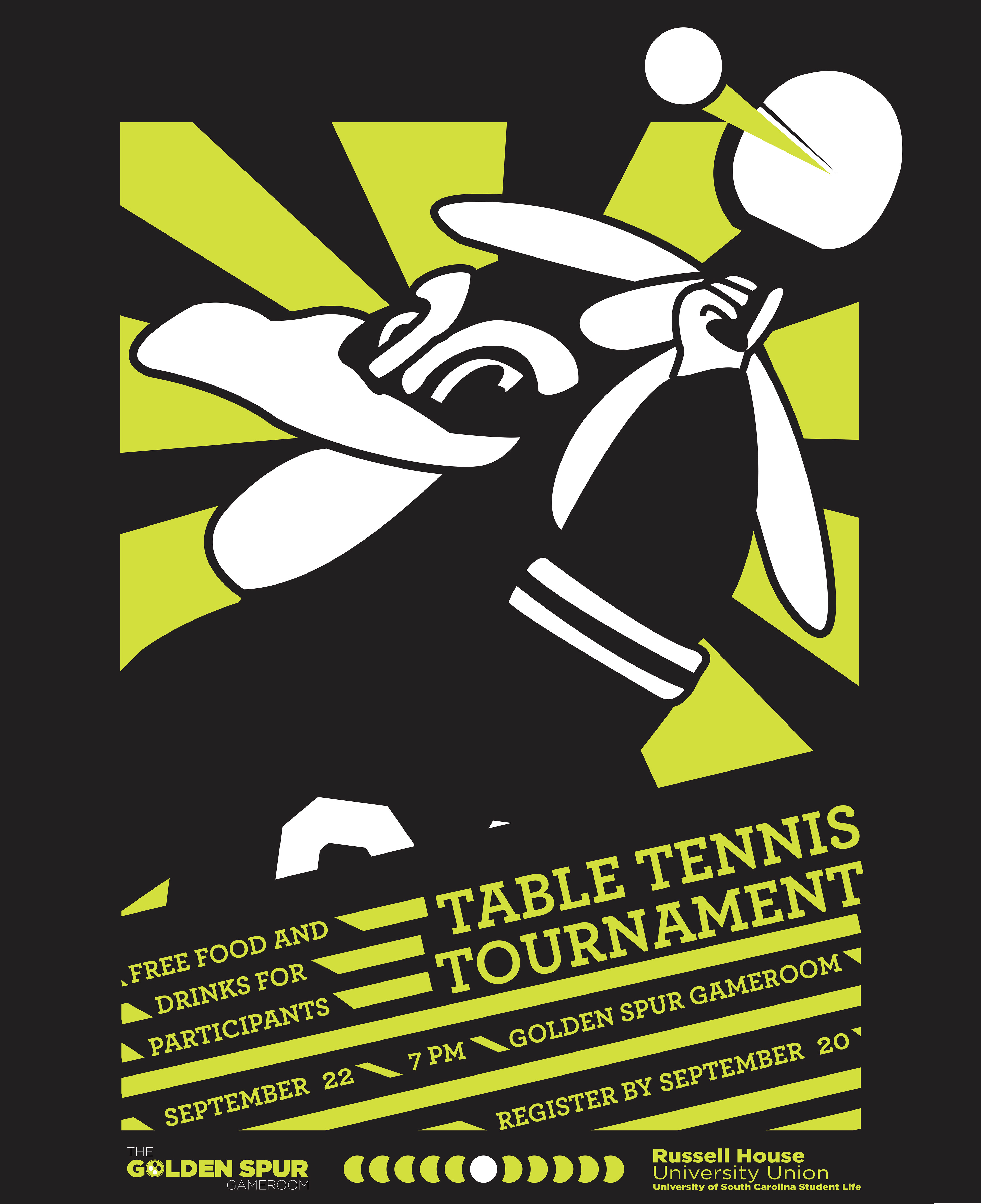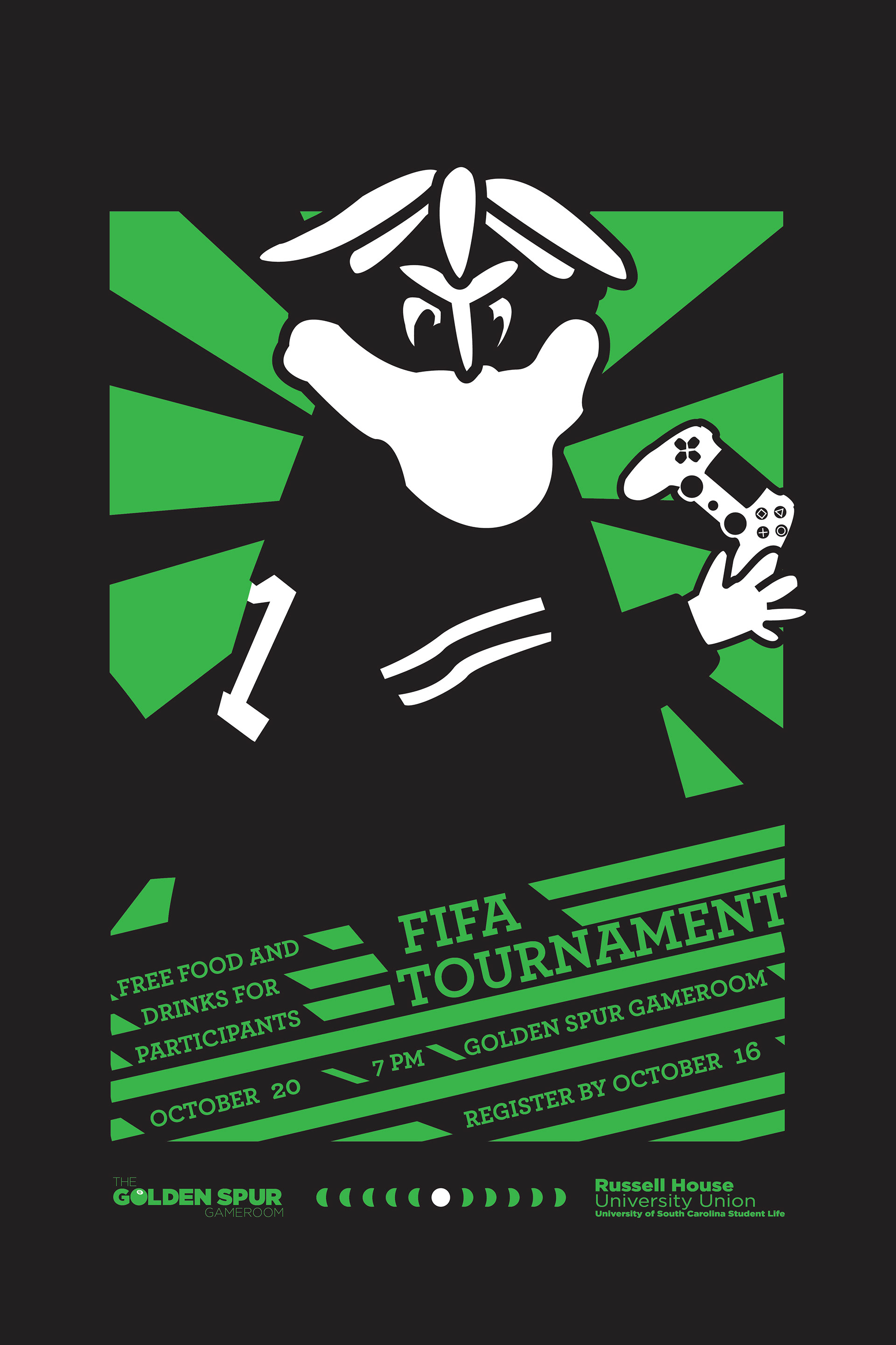 Two separate posters with hand drawn U of SC mascot representing different University Golden Spur Gameroom events.